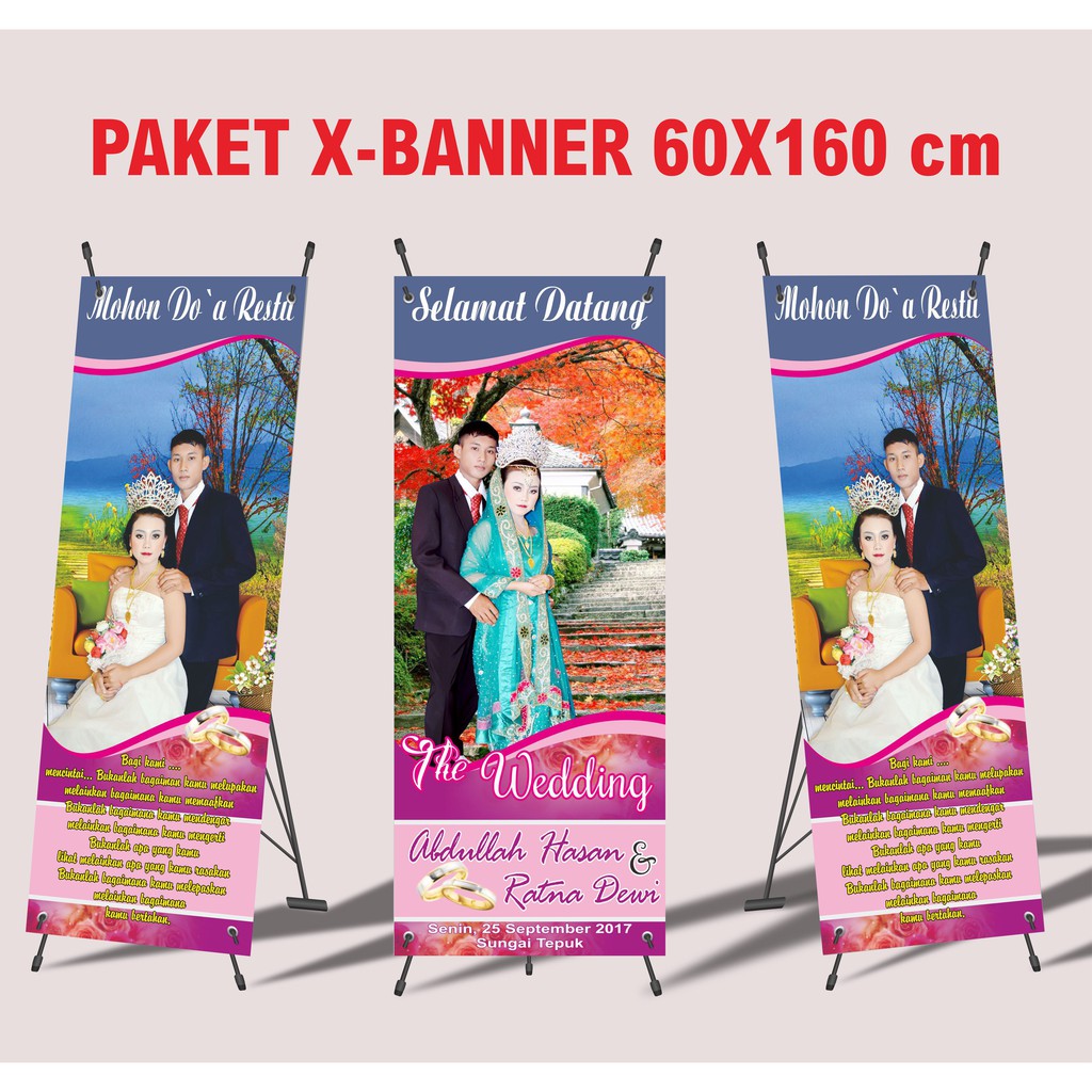 100.000 *harga belum termasuk ppn. Khusus wedding, umumnya hanya menampilkan nama dan foto calon pengantin disertai ucapan selamat datang. Sering digunakan untuk spanduk partai atau ucapan selamat datang. X banner pernikahan berfungsi sebagai alat penyambutan para tamu undangan atau dapat disebut juga banner selamat datang. Jual x banner selamat datang pernikahan.